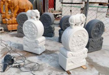 放置于寺廟、住宅等建筑的門檻兩旁,可以穩固門面。鼓面常刻有螺旋紋,故又稱為螺鼓石。傳說有漢白玉浮雕小象擺件抱鼓石雕塑進入廟中,門鼓即會嘎嘎作響提醒廟中人。